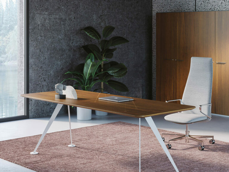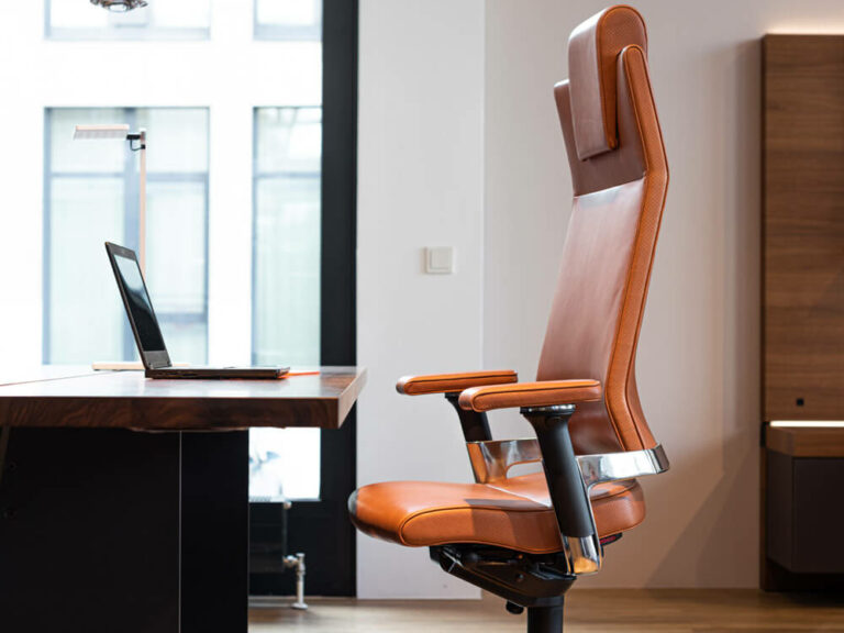 Echtholzfurniere oder Lackfinish als Möbeloberflächen, Lederbezüge oder anspruchsvolle Textilien für die Büro- und Besprechungssessel, Gestell- und Metallkomponenten in hochglanzpoliertem Aluminium oder glanzchrom – durch die gekonnte Komposition von Material, Farbe, Verarbeitung und Dimension schaffen wir den gleichermaßen repräsentativen wie selbstverständlichen Raum für eine Führungspersönlichkeit.